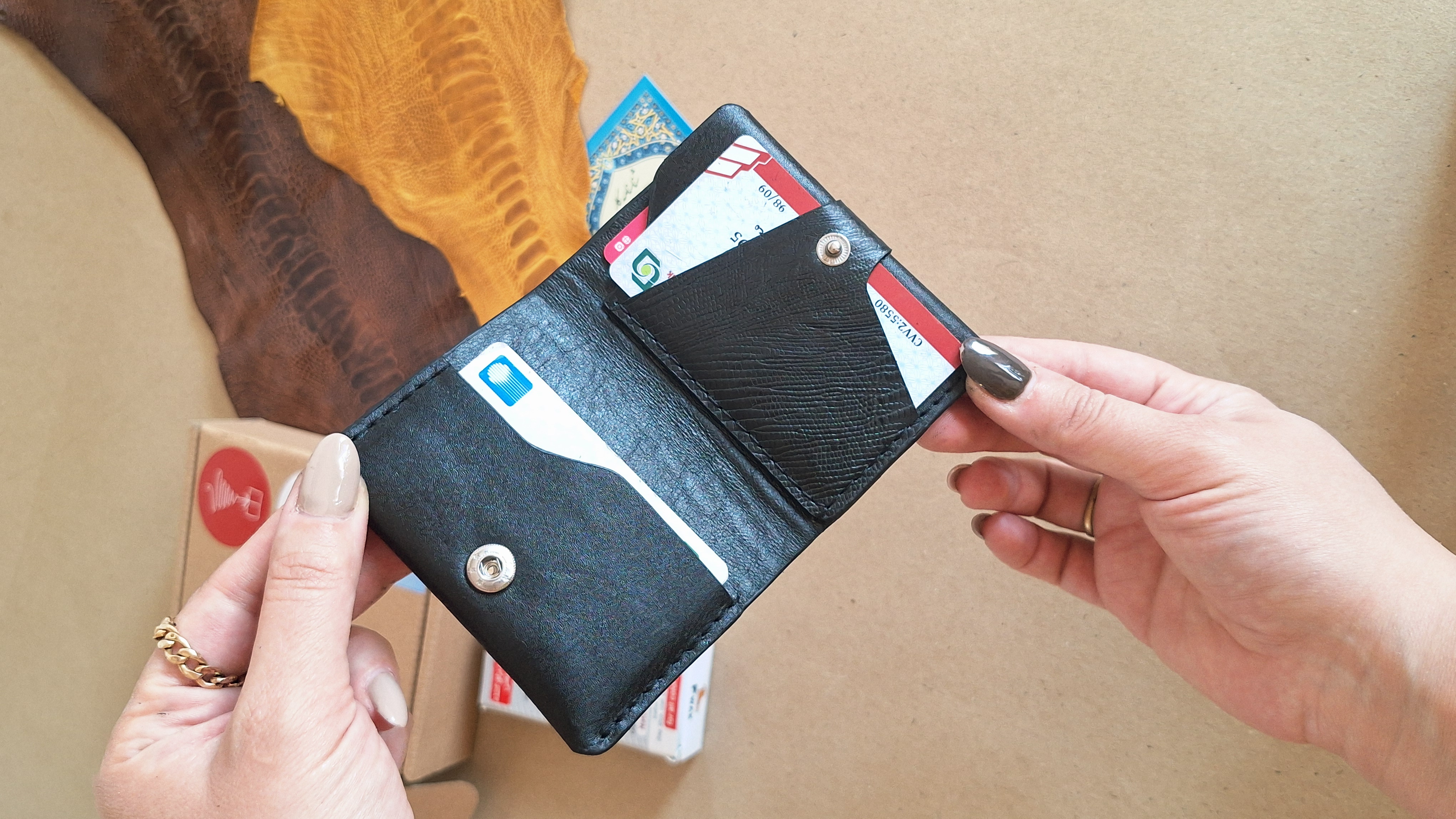 کیف جاکارتی چرم طبیعی به گونه ای ساخته می شود که هم به راحتی قابل حمل باشد و هم فضای کافی برای نگهداری کارت های بانکی و مدارک شناسایی و اسکناس تاشده فراهم کند. طراحی به صورتی است که در کیف یا جیب شلوار پارچه ای یا لی، کت یا پالتو به راحتی جا می شوند.