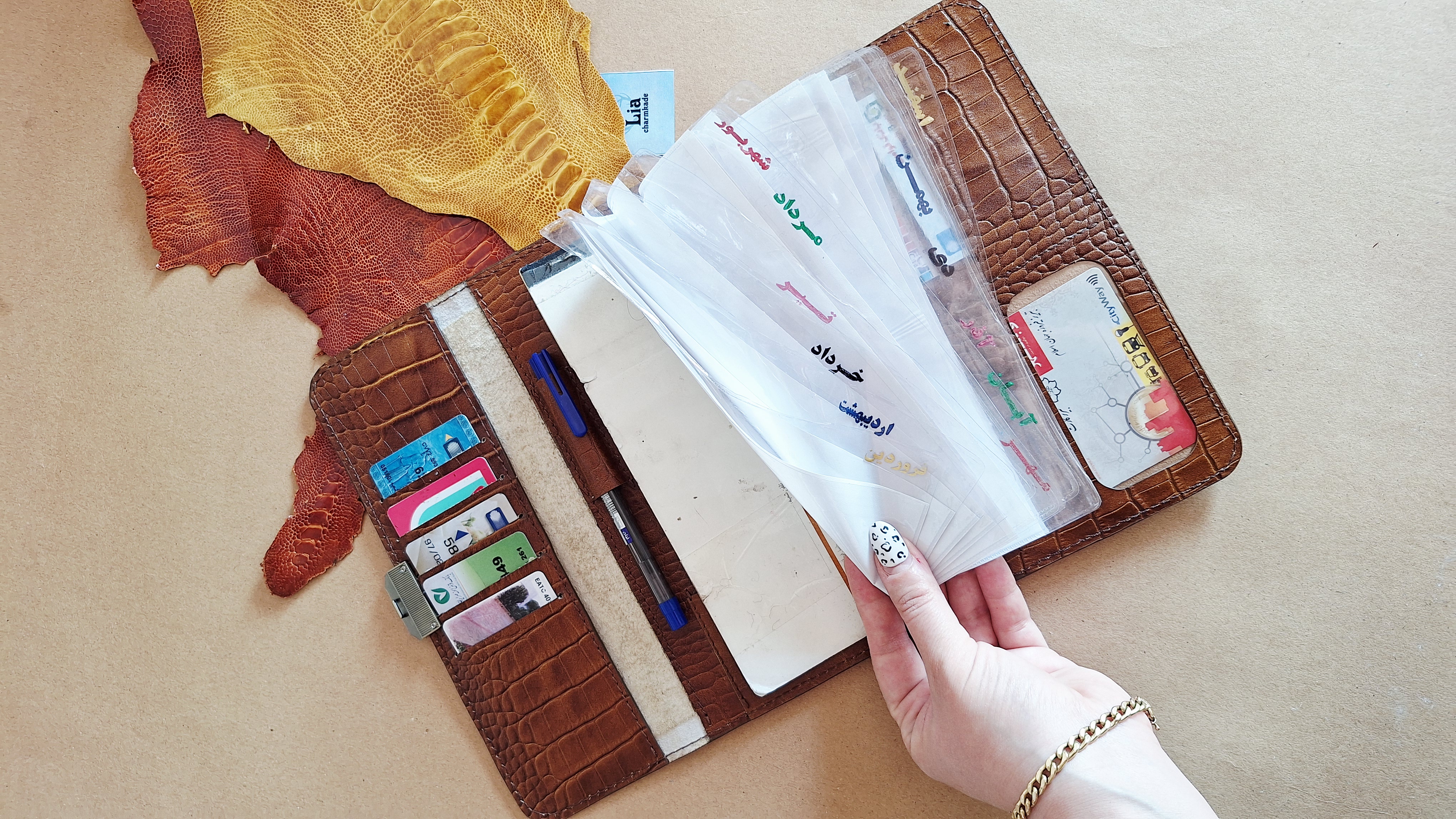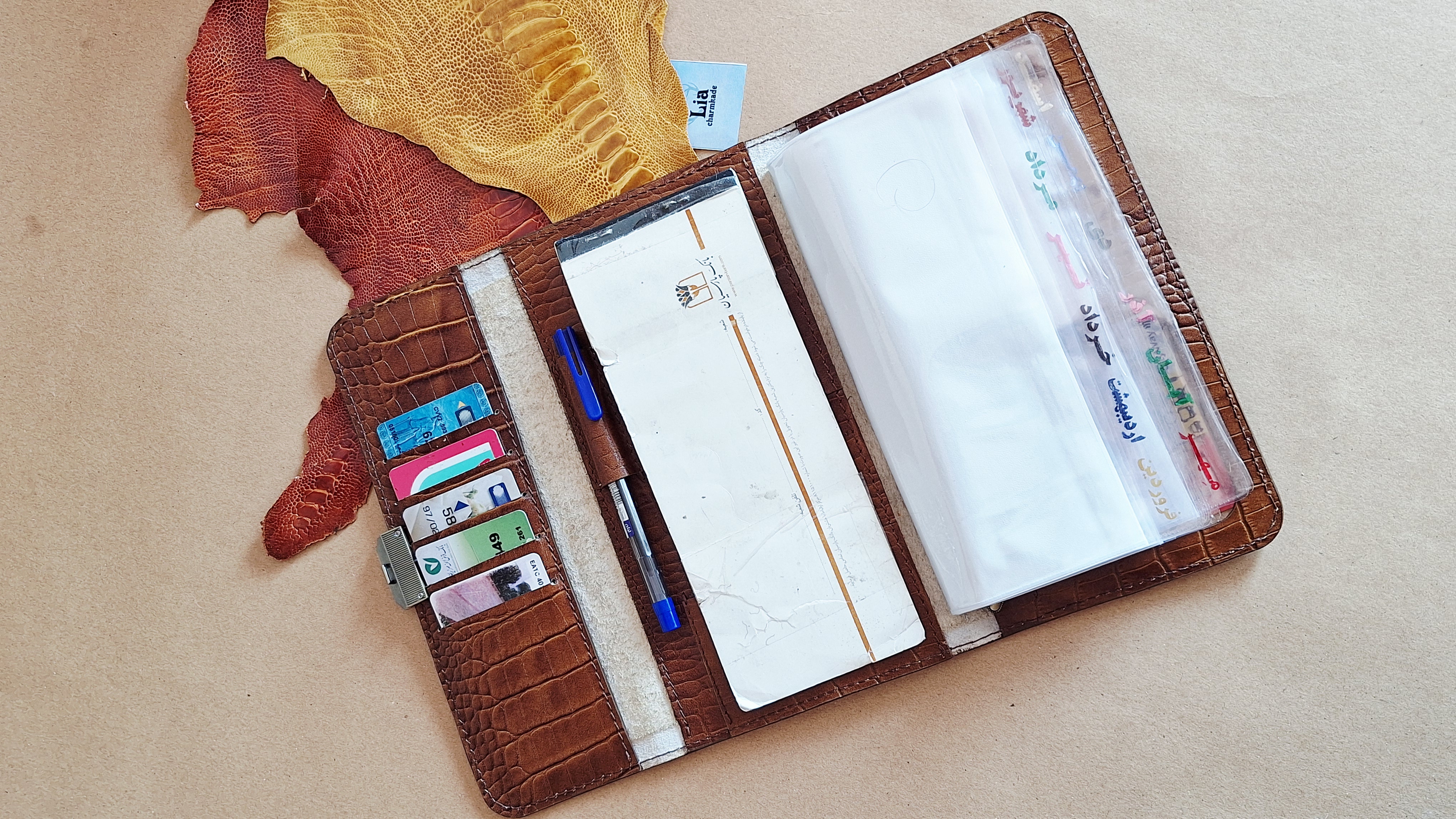 این محصول مختص آقایونی است که زیاد با چک سرو کار دارند، برگه چک ها همیشه لای دفتر هست و مرتب و براساس تاریخ نیس، این البوم چک با داشتن ۱۲ جای مجزا که اسامی ماه ها به ترتیب نوشته شده و هر ماه دوجای مجزا هم دارد که چک های برگشتی و وصولی جدا شود. این کیف که تماما با چرم گاوی درجه یک دوخته شده در واقع کیف مدارک و دسته چک و کیف پول هست که می تواند اسکناس، موبایل، کارت اعتباری، خودکار ، کلی برگه چک، مدارک بیمه و ... به سهولت جابگیرد.