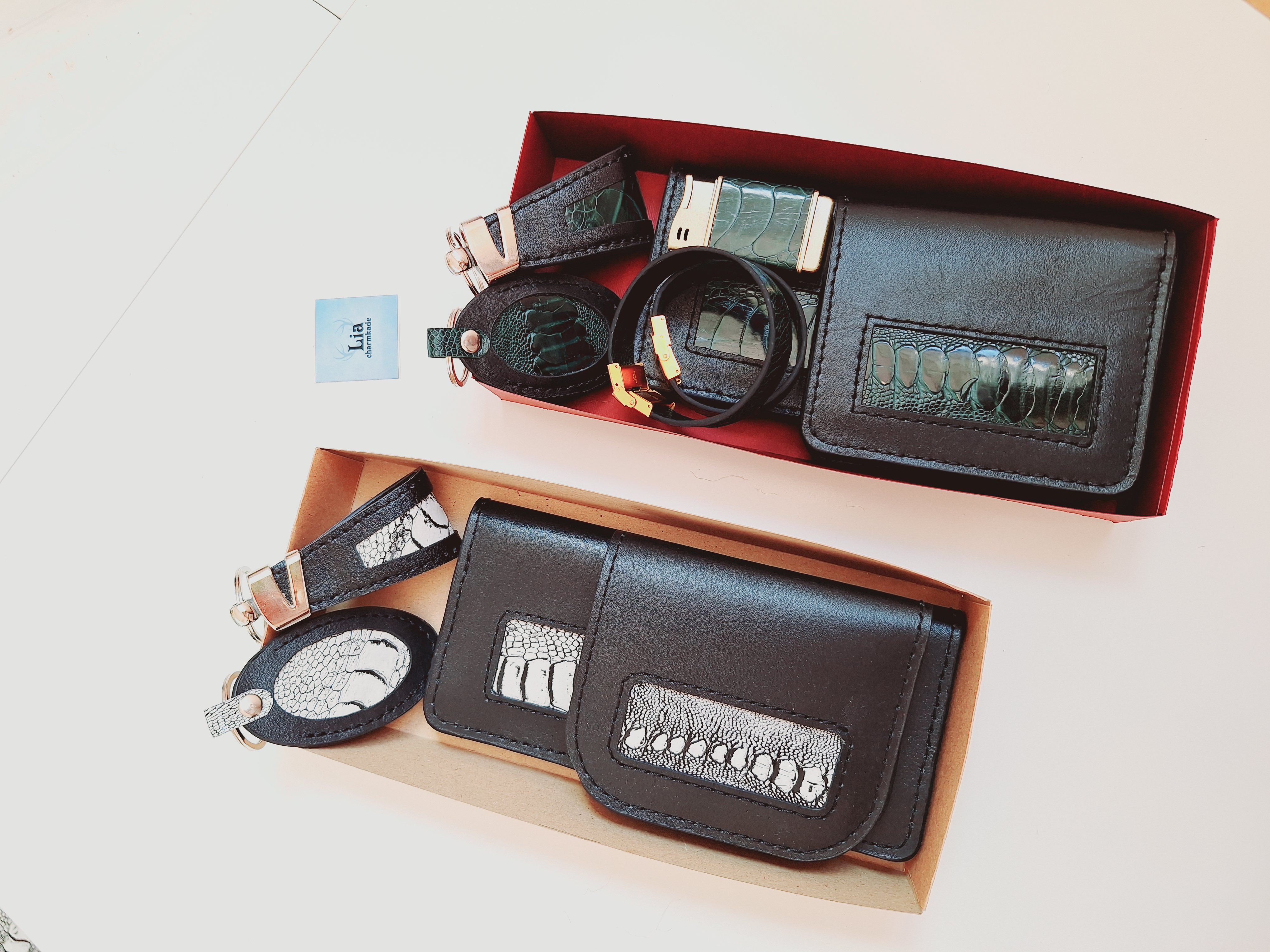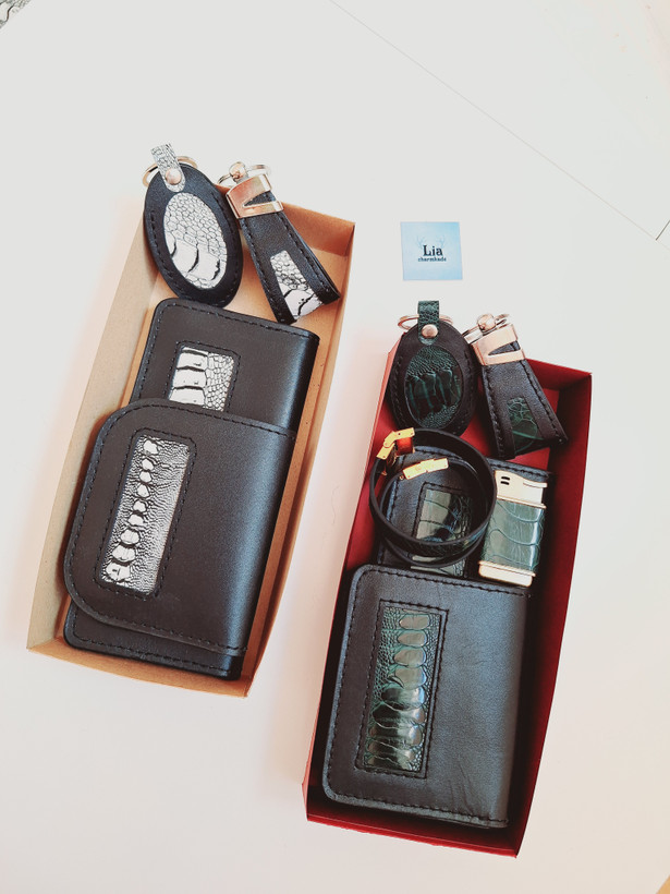 آیتم های ست: کیف پالتویی، کیف جیبی، جاکلیدی حلقه ای و یراق دار، فندک پیپ